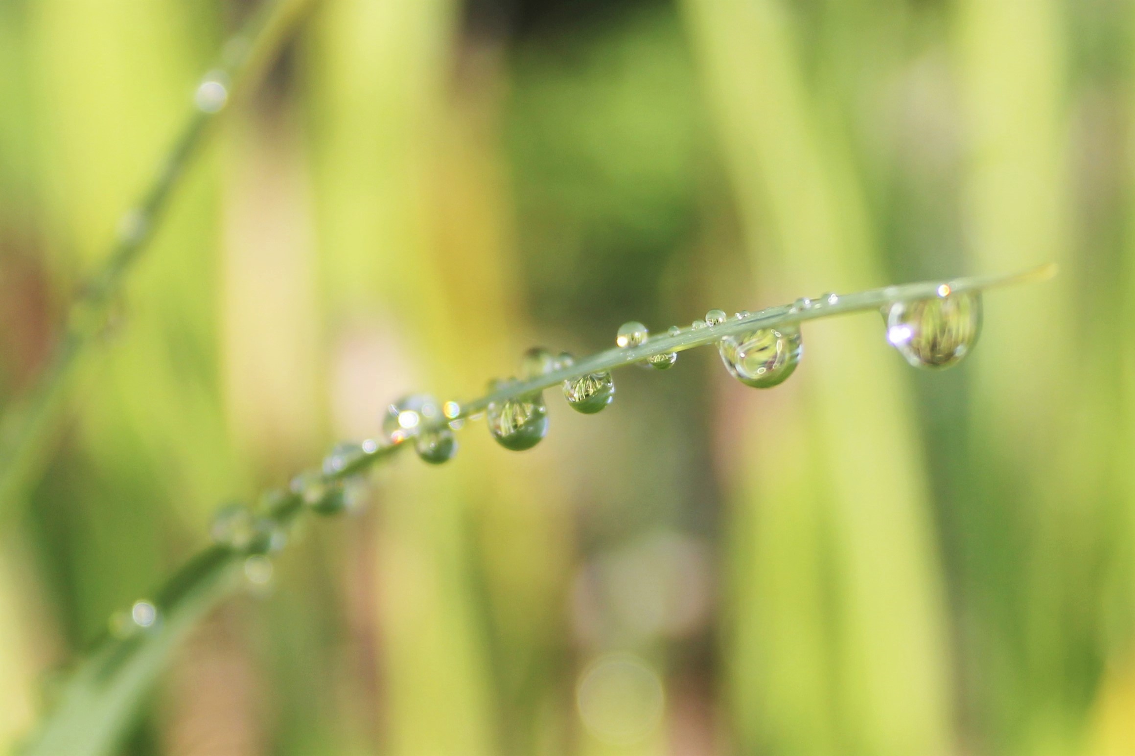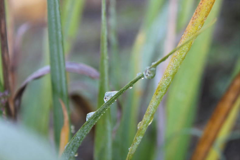 刈り取らないでいた花菖蒲の葉に露が付いていました。落ちることなく付いています。