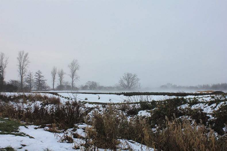 その雪がまだ残っている川向こうの風景です。霧の中に広がるモノクロの世界が良いです。