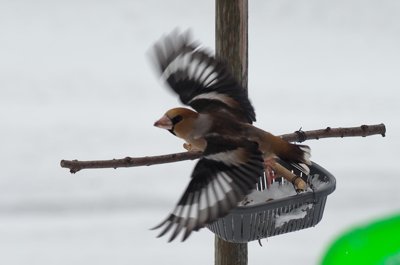 このところ餌台に来るのはシメだけです。たくさん食べますからヒマワリの種を買ってきました。