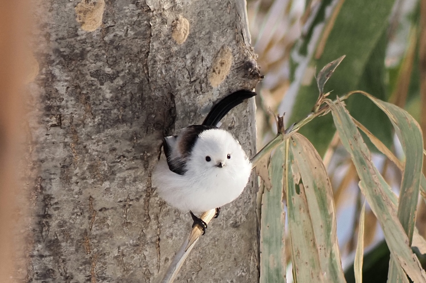 ハンの木の皮の下にいる虫を捕食しているシマエナガがこちらを向いてくれました。