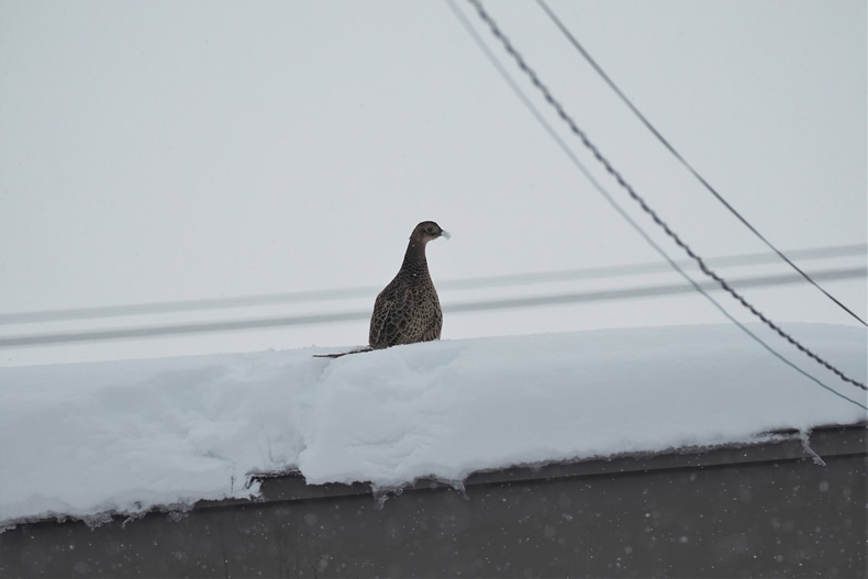 向かいの家の屋根の上に大きな鳥がいます。なんとキジの雌でした。