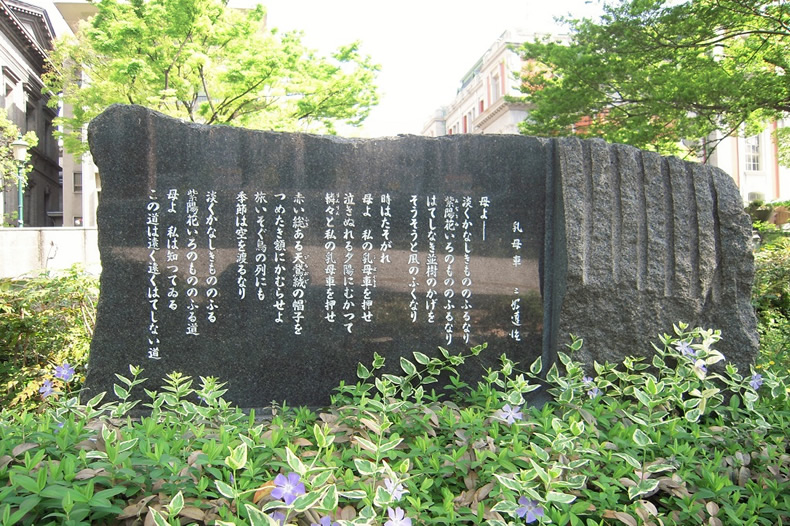 土佐堀川沿いに西に行くと、三好達治の「乳母車」という詩を彫った碑があります。