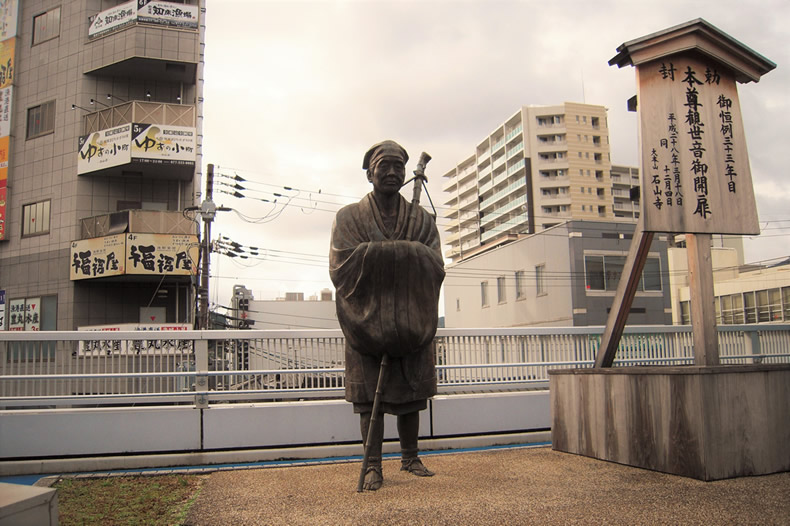そこに芭蕉像があります。杖の大きすぎるのが少々気になる像です。