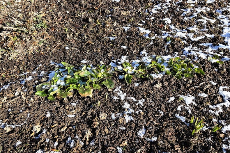 朝庭には薄く雪が積もり、リュウキンカは雪に隠れていましたが、だんだん解けて家を出る時には降った雪は消えました。