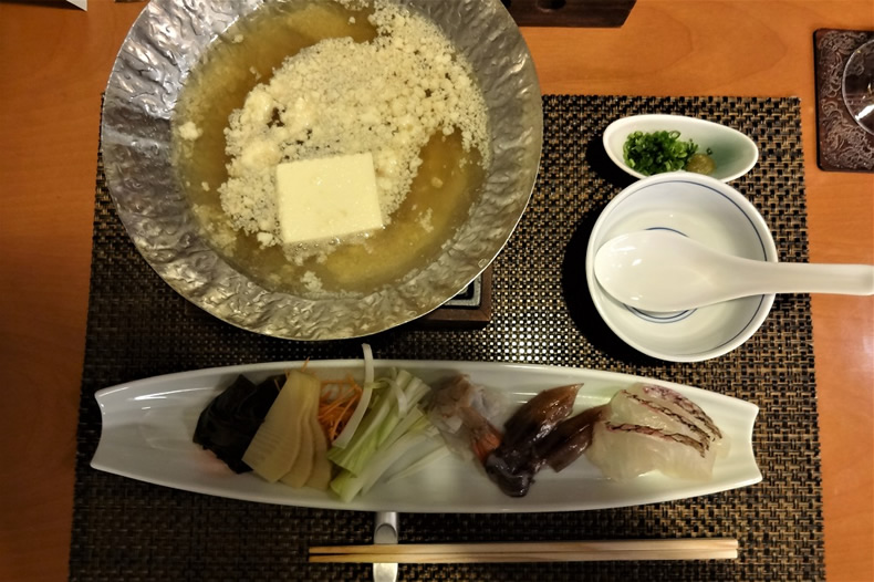 夕食は春らしくということで、ホテルレストランで春慶会席を食べました。 春かすみ豆腐小鍋では、蛍烏賊・筍などをしゃぶしゃぶ風で食しました。