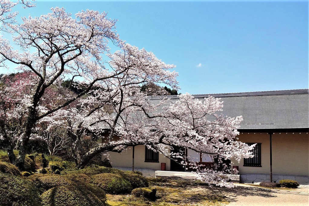 庭園の桜は満開でした。奧の建物は西行記念館です。4月1日から開館でした。