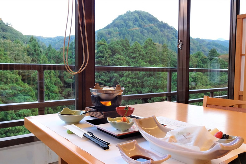 夕食は「秋の華会席」、窓側の席で景色を眺めながらいただきました。2泊目は滞在献立