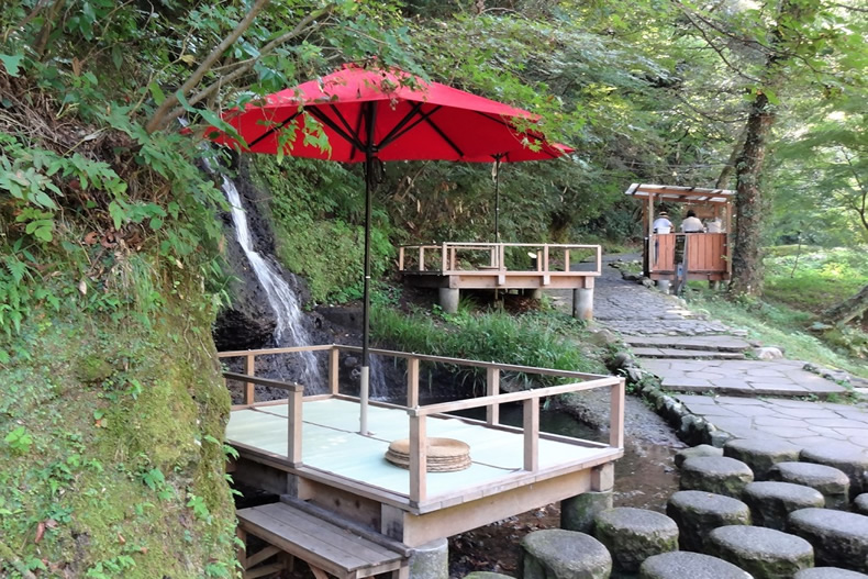 対岸側からも、こおろぎ橋に近づくことは出来ませんでした。それで鶴仙渓の遊歩道を歩いてあやとり橋へ向かいました。途中に川床(かわどこ)がありました。