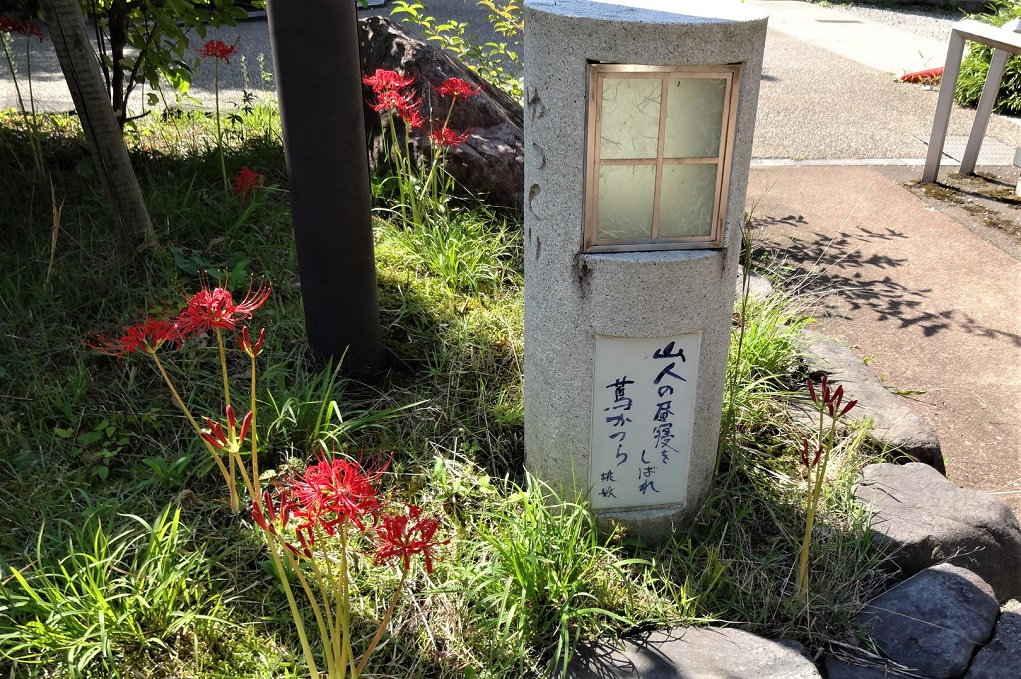 今年も桃の木公園に 彼岸花 が咲いているかと寄ってみました。桃妖 の句碑の傍に彼岸花が咲いていました。