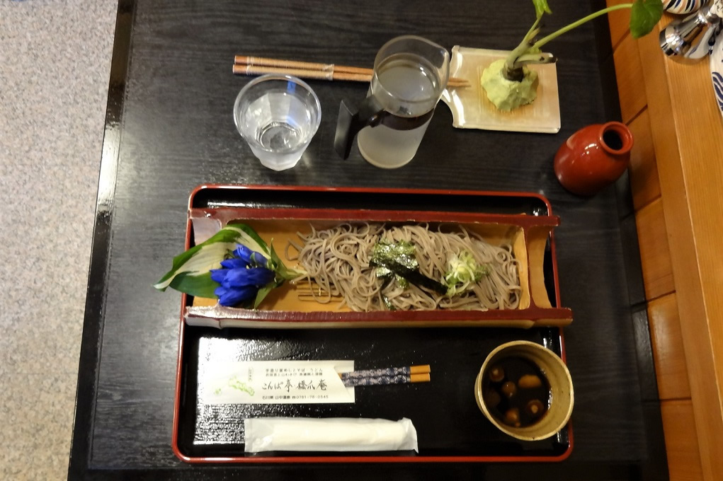この日、山中温泉は気温が30度を超えて暑い日でした。昼食は冷たい蕎麦をたべました。 花が添えられ、わさびがたっぷりで美味しくいただきました。