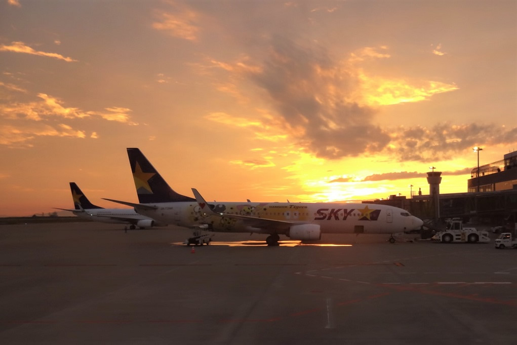 帰りは神戸空港から乗りました。左隣のスカイマーク機が夕日に照らされていました。