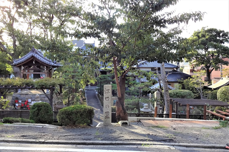 江口の君堂は、立派な 鐘楼 もあり思っていた以上に大きなお寺でした。正面に「江口の里」 の石碑が建っていました。