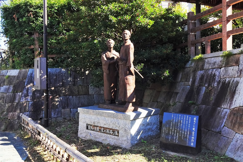 【写真:No9芭蕉句碑】 濠川(ほりかわ)の所に坂本龍馬とお龍の像が建っていました。