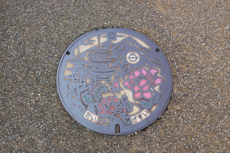 近鉄電車当麻寺駅から寺に向かいます。道路のマンホール蓋には、