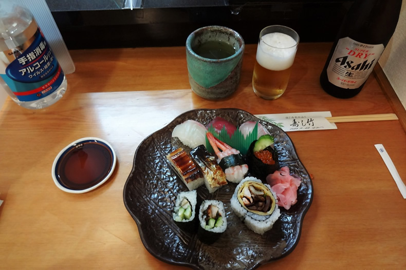 昼時になりまず昼食をとりました。15年前に食べた寿司屋さんが営業していました。写真の他に茶わん蒸しなどがつきました。