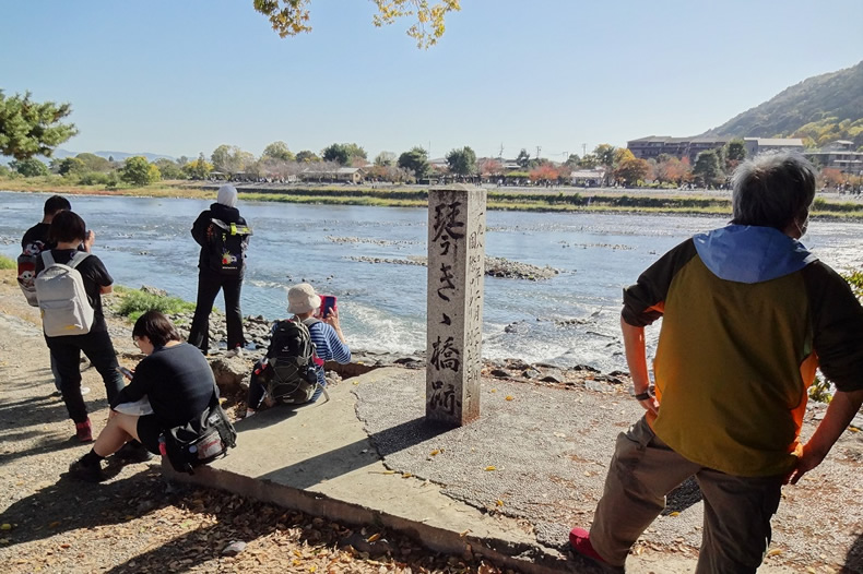 小督 を探した 源仲国 が、小督の弾く琴の音を聞いたという橋の碑が 渡月橋 北詰にあります。この碑は1980年に建てられたものですから新しいものです。