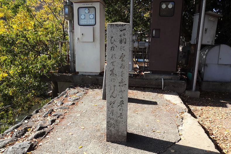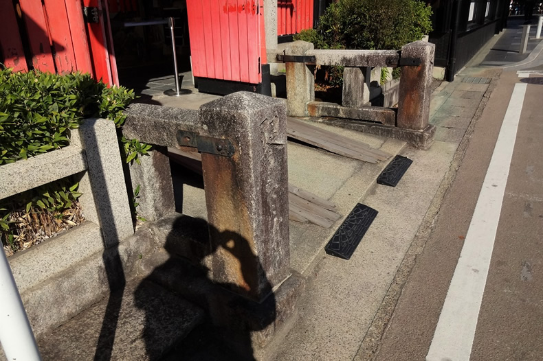 店を出て 小督 塚に向かいました。途中にある車折(くるまざき)神社嵐山頓宮の門前に、琴聴橋の一部らしきものがありました。芭蕉が訪ねた時でも小督屋敷と呼ば