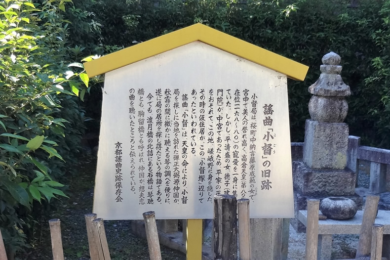 小督塚の前にある説明版を読むと小督の身の上がわかります。芭蕉が500年ほど経って訪ね、芭蕉が訪ねてから約330年、時の流れを覚えました。