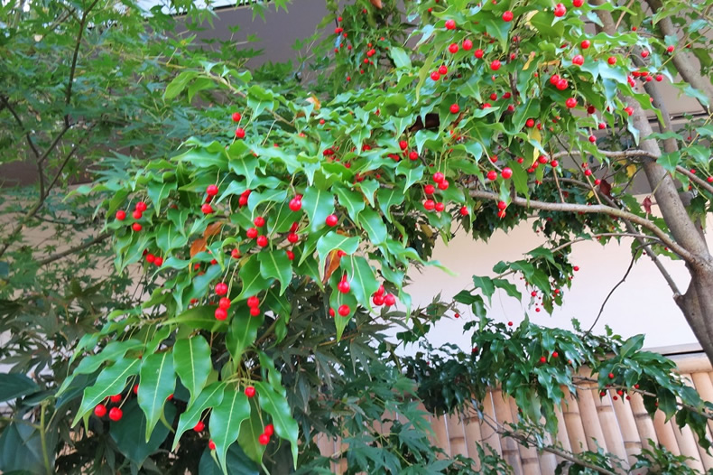 近くの民家の塀に赤い実の付いた木がありました。調べると ソヨゴ でした。北海道にはない木です。
