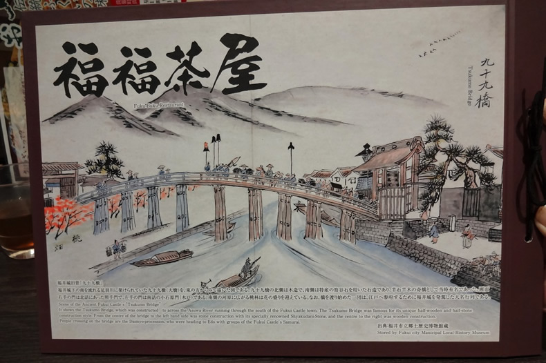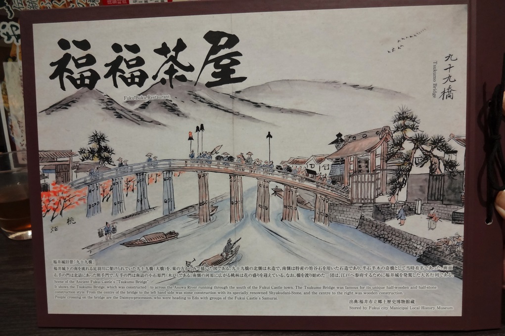 西口にハピリンという高層ビルが建ち、その2階に飲食・物産店などが入っている。福福茶屋 という店で昼食をとる。メニューの表紙に通る予定の「九十九橋」が書かれていた。