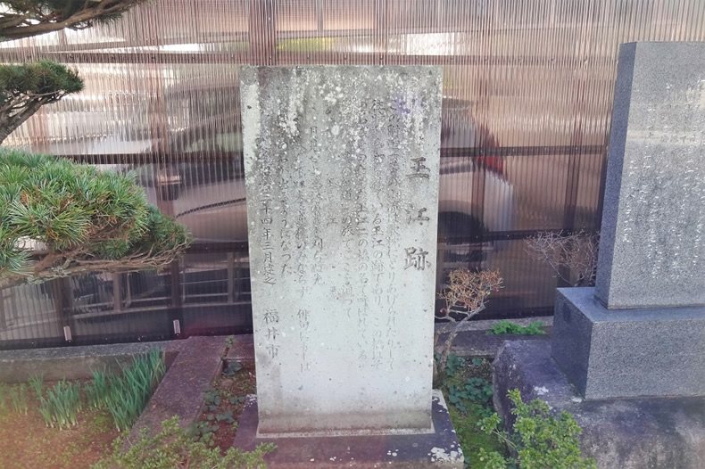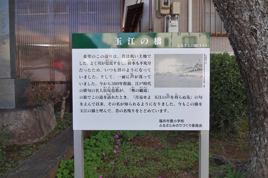 玉江について説明版がありました。石に彫った碑がありましたがよく読めませんでした。橋の銘板には「たまのえにのはし」とありました。漢字では玉江二の橋と書きます。「月見せよ玉江の芦を刈らぬ先」の句は奥の細道には載っていません。
