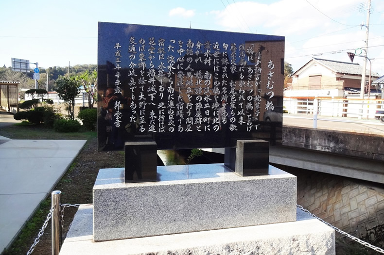 あさむつ橋は、漢字で書くと浅水橋(あさうずはし)のようです。朝六橋とも書くようです。枕草子に「橋は あさむつ橋 ながらの橋・・」とあるので平安時代から有名な橋だったのでしょう。