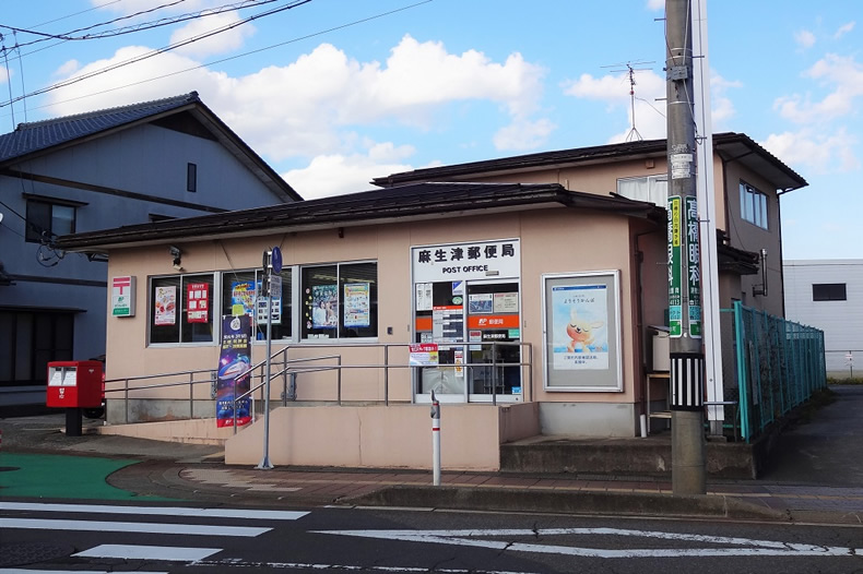 橋の近くに「麻生津郵便局」がありました。「あそうづ」と読みます。住所は浅水町(あそうずちょう)です。地名の読み方は難しいです。