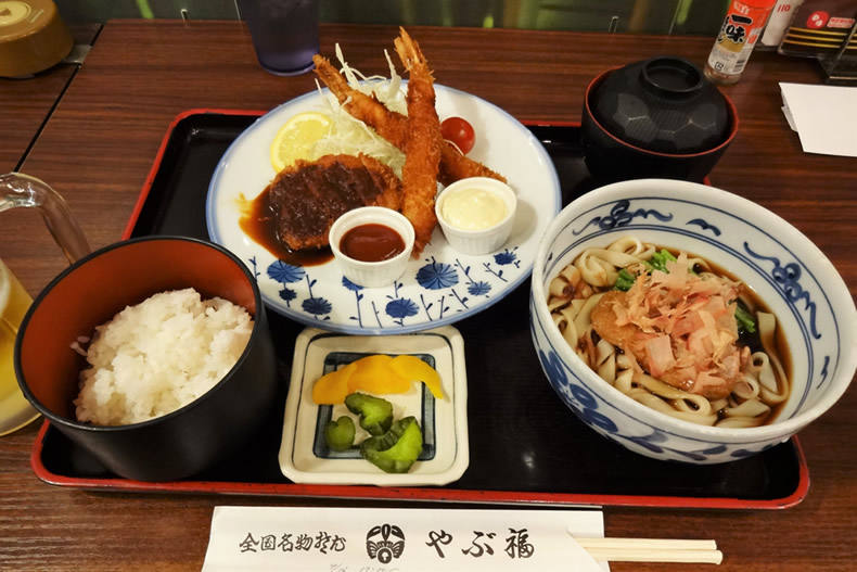 名古屋のホテルで一休みし夕食はみそかつ、エビフライ、きしめんがセットの定食を食べました。ビールはサッポロビールでしたのでお代わりしました。