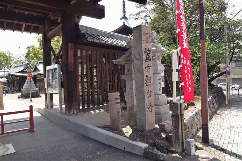 名鉄電車で本笠寺(もとかさでら)下車、すぐ近くに笠寺の西門があります。