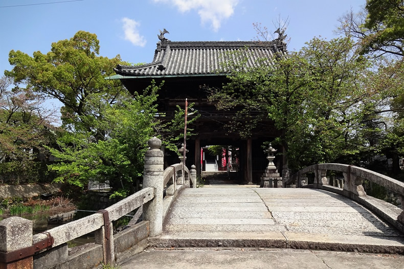 【写真:No44 4.17笠寺の歴史】 池にかかる太鼓橋の先に山門があります。