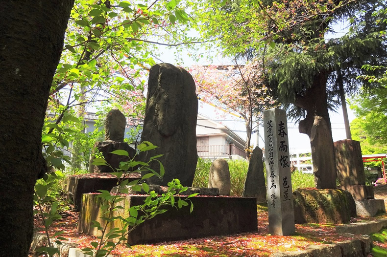 【写真:No46 4.17放生池アオサギ】 「笠寺や漏らぬ岩屋も春の雨」の句碑が木立の中に建っていました。