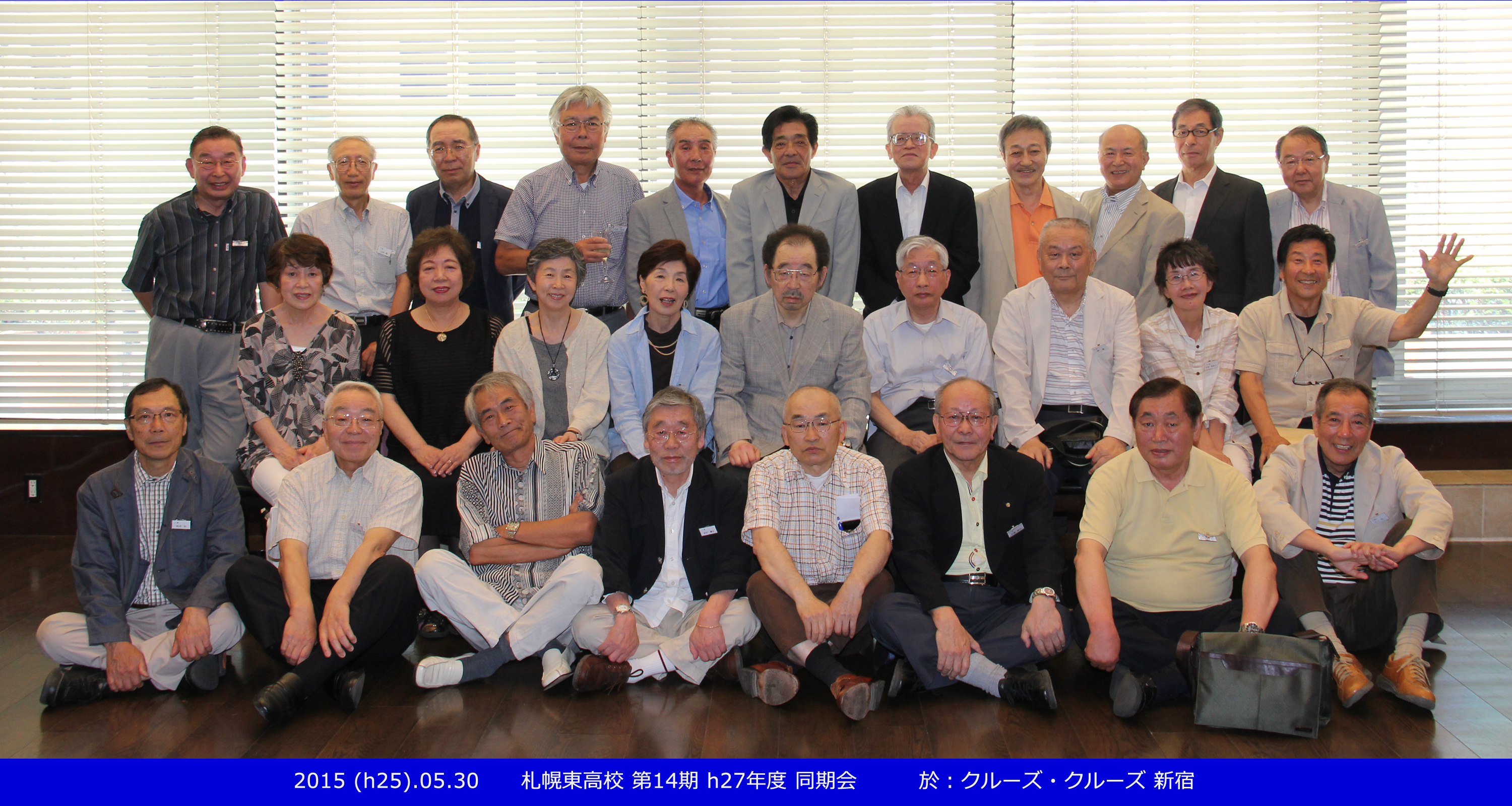 | 感想 | 昨年、札幌で「卒業50周年・古希記念同期会」に続き、今年は東京新宿で「平成27年度第14期同期会」を開催した。札幌から4名、総勢28名が参加した。終戦時生まれの14期の仲間も今年70歳です。まさにアラコキ(Arround70)です。このため、同期会も 「一期一会」 の会になりつつあります。出席者の意見として、この会をひきつづき毎年開催することと来年度の幹事を決めた。アラコキにもかかわらず結構お酒もすすみ、昔話に花をさかせていました。近くの居酒屋で二次会をした後散会した。 |