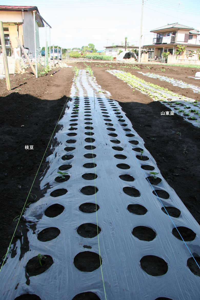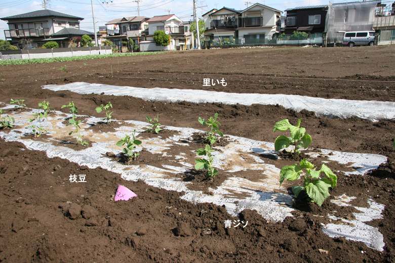 苗から定植した枝豆です。里芋は発芽を促すため マルチ してあります。右奥に、しょうが を植えました。