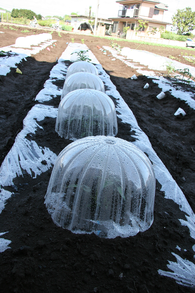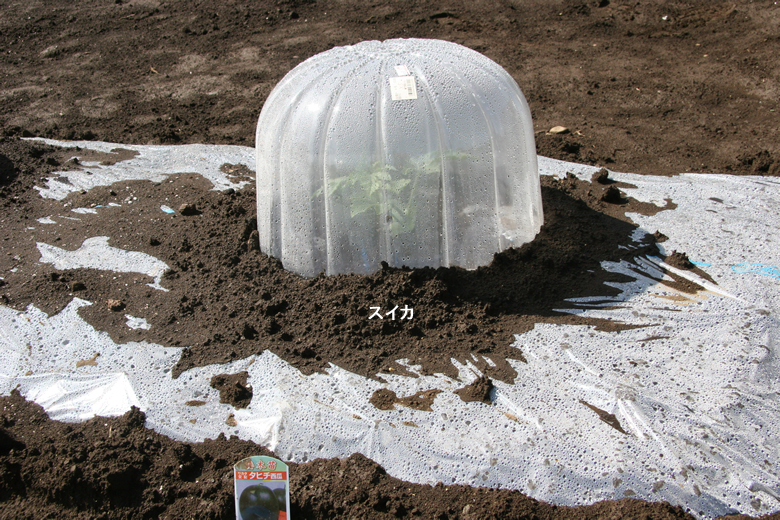まだ定植するには早かったので、スイカ 同様 苗帽子 をかぶせました。