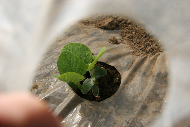 エダマメ3 月 29 日種まきしたエダマメが苗ほどの大きさに成長しました。トンネルの穴から撮影。