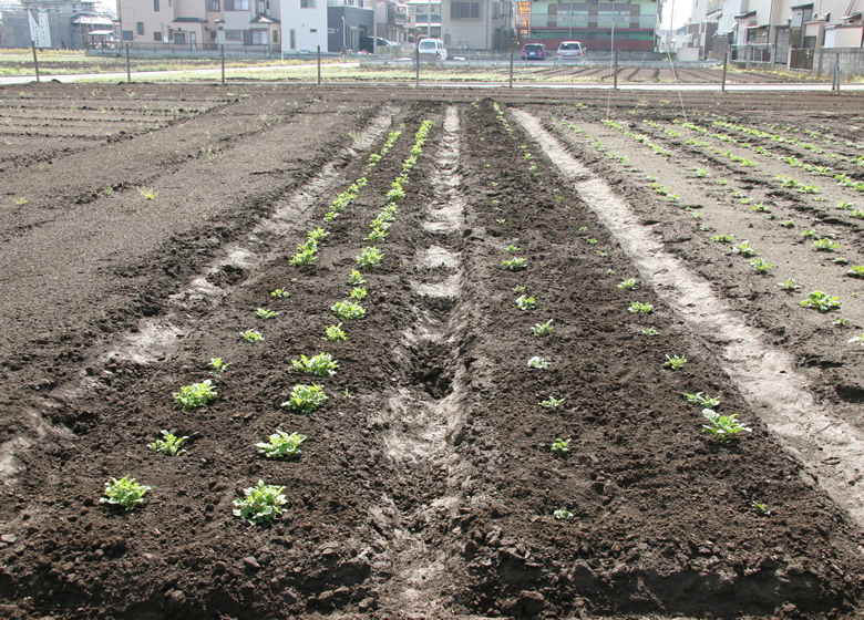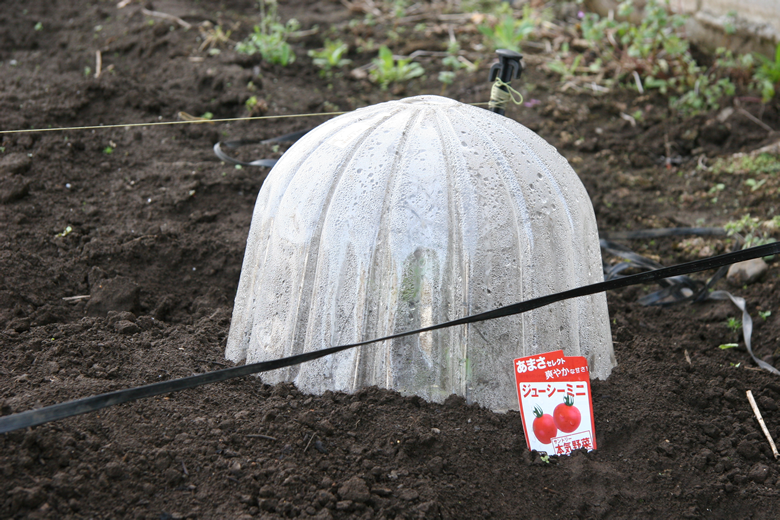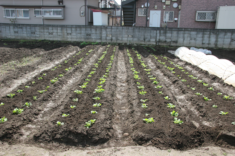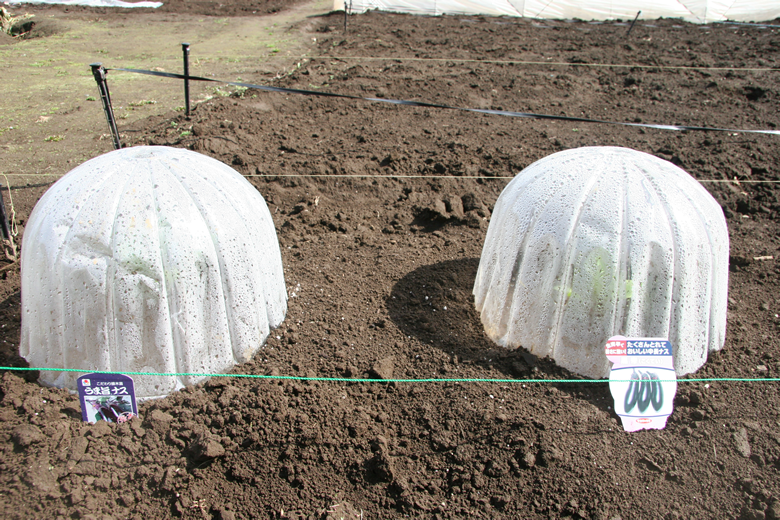 風と寒さ予防に、囲いをしてあります。マルチをしませんでした。元肥は昨年より少なめにしました。