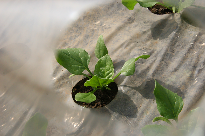 エダマメ、ほうれん草が寒い春のなかで順調に生育しています。