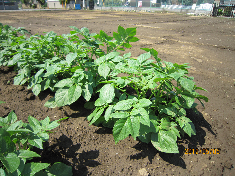 3月19日に植えたキタアカリが大きな葉をつけました。種芋を植えたときに、肥料を多めに施しました。