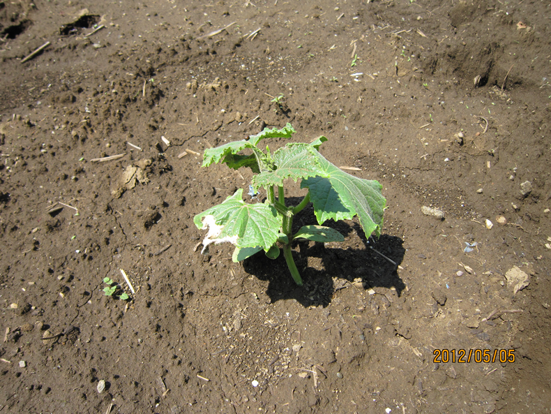 4月16日に苗を植えました。地面近くで収穫する種類のキューリです。