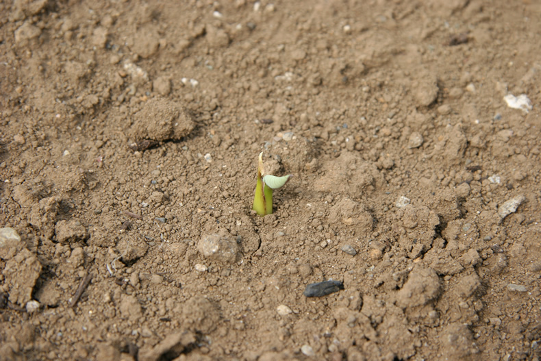 4月25日に植えたエダマメは全滅でした。原因は雨が多かったため、種が溶けた?(マメ類は水に弱い)。