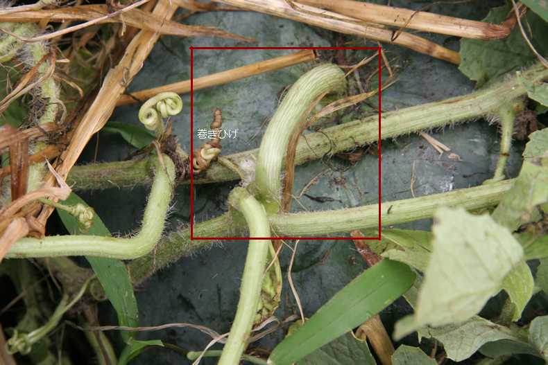 下写真赤枠内の巻きひげはまだ青々としておりますので、収穫時期ではありません。