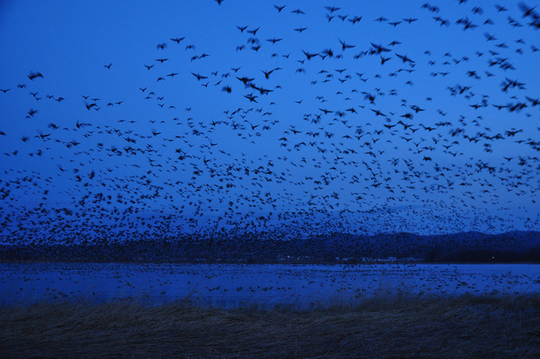 夜明け前、一斉に餌を求めて近くの畑へ。