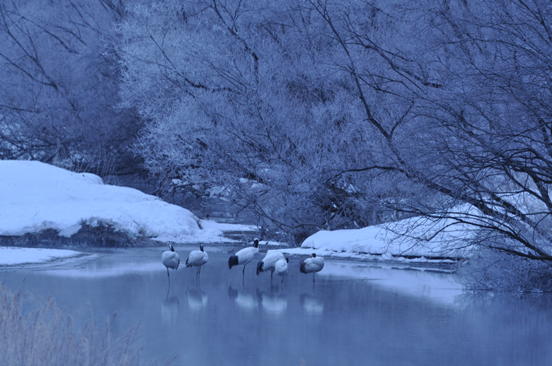 鶴たちが樹氷につつまれて寝ています。