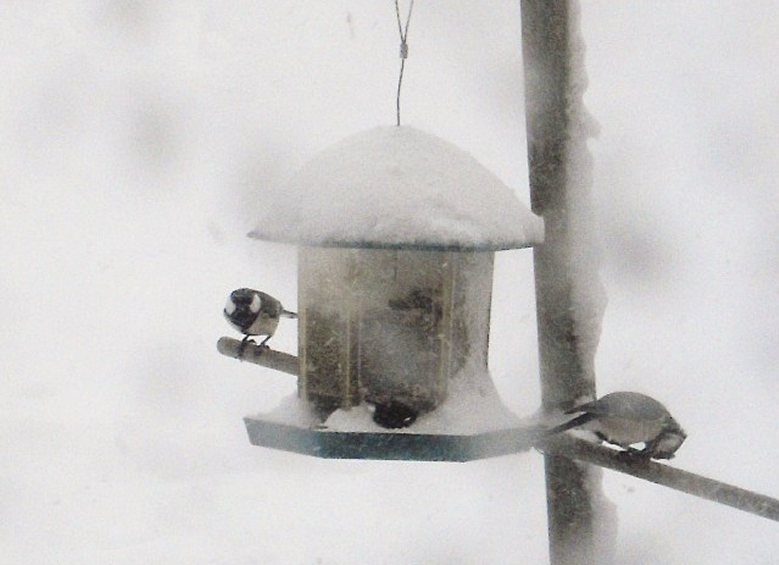 吹雪の中、懸命にヒマワリの種を突いているシジュウカラの写真を添付しました。