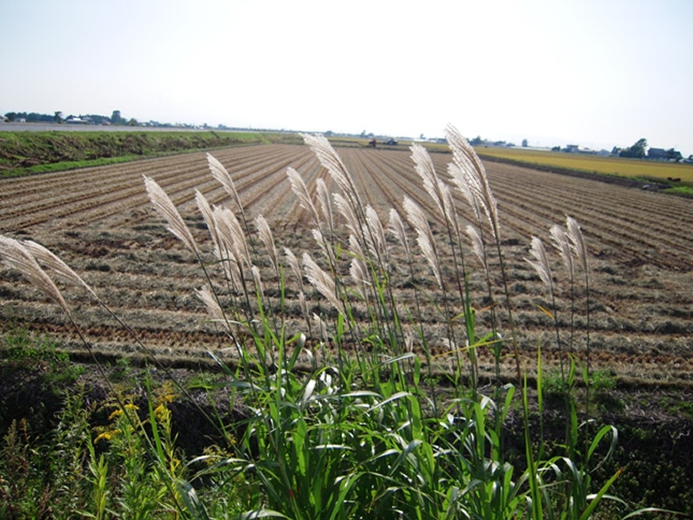 刈り入れの終わった田んぼの横でススキが風に揺れていました。