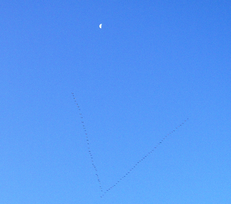 空には夜明けの白い月があり 「月と雁 」 の取り合わせも見ることができました。