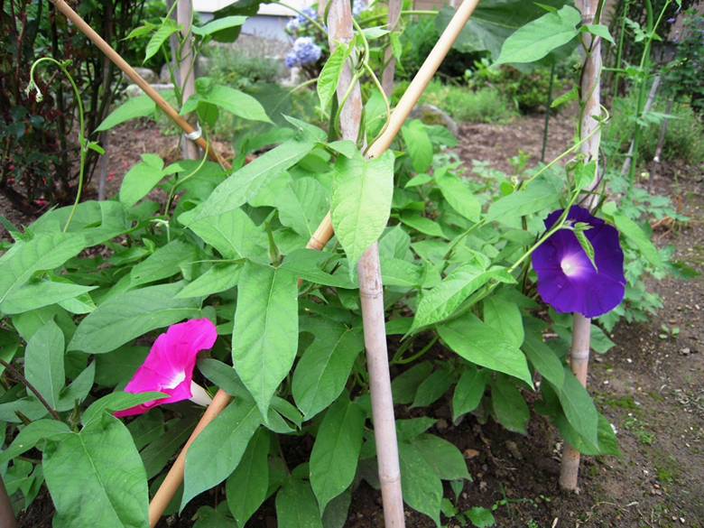 アサガオのツルが巻きつくように、竹で支柱を立てました。