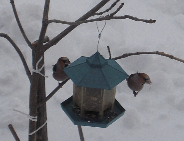 シジュウカラがたまに来るだけでしたが、今日(3/5)シメの群れが初めてやって来ました。