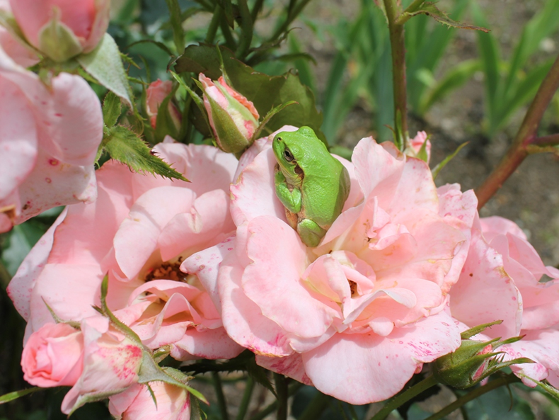 シジュウカラが毎冬エサを食べに来るのには慣れていますが、カエルがバラのベッドに1年経って戻って来るのには驚きました。