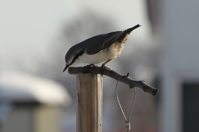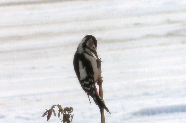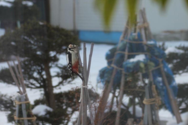 アカゲラも飛んで来て冬囲いの竹を突っついていました。